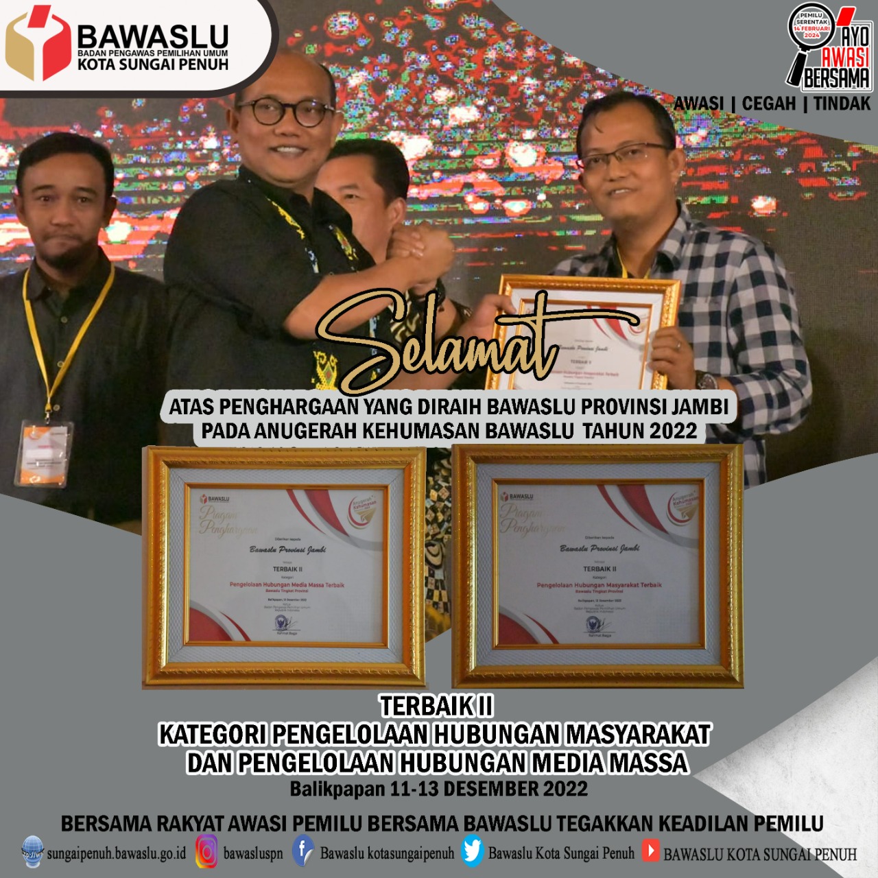Bawaslu Provinsi Jambi mendapatkan dua penghargaan sekaligus dalam Anugerah Kehumasan Bawaslu Tahun 2022, yakni sebagai terbaik kedua dalam Pengelolaan Hubungan Masyarakat Terbaik Bawaslu Tingkat Provinsi dan terbaik kedua dalam Pengelolaan Hubungan Media Massa Terbaik Bawaslu Tingkat Provinsi.