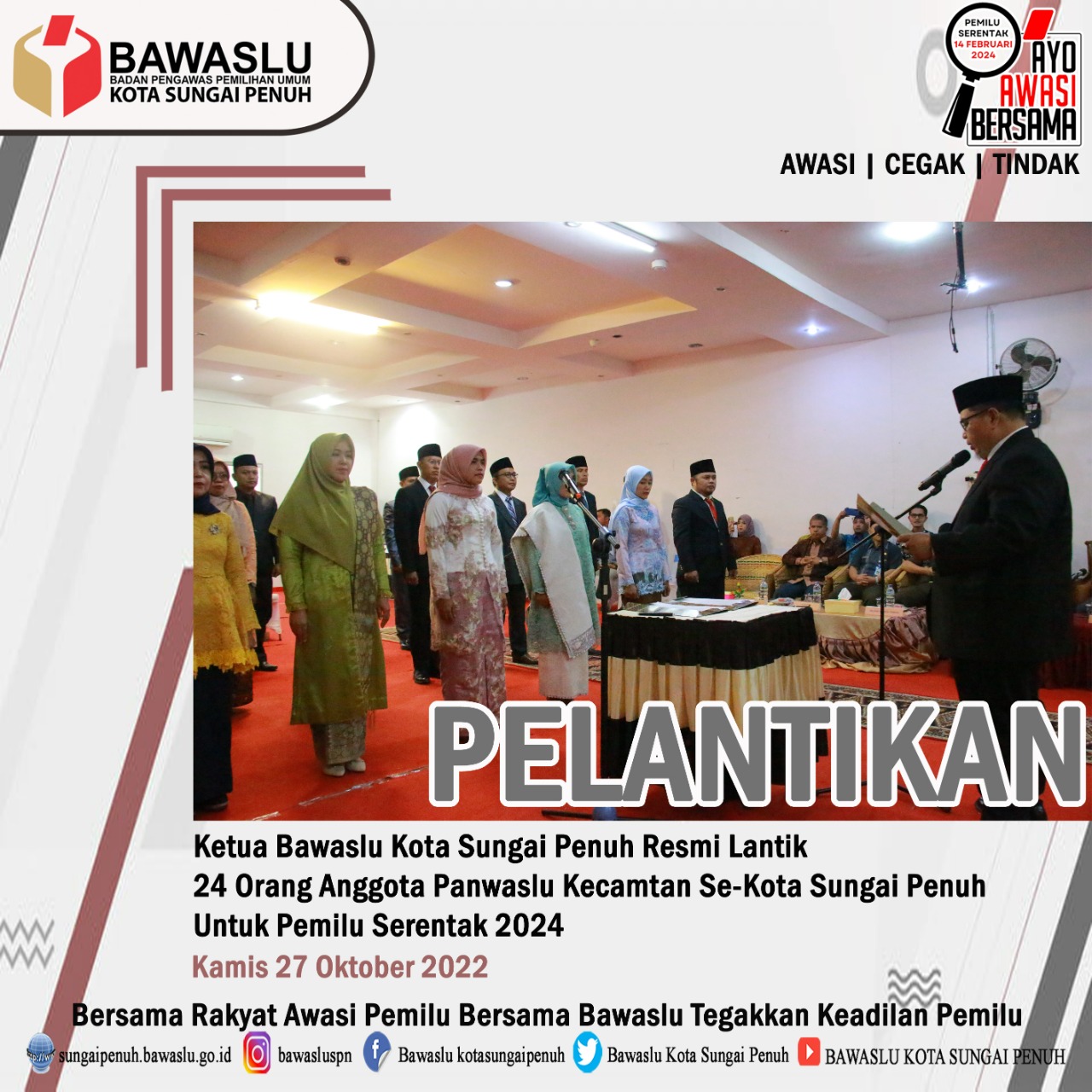 -KOTA SUNGAI PENUH, BAWASLU- Ketua Bawaslu Kota Sungai Penuh Jumiral Lestari Resmi lantik 24 anggota Panwaslu Kecamatan Se-Kota Sungai Untuk Pemilu 2024 (27/10/22)